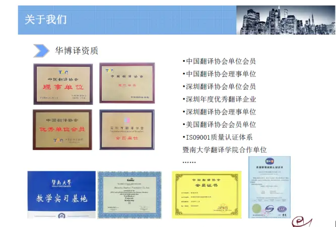 华博译翻译公司是一家将语言、知识、文化与技术融合起来,为企业提供专业规模化的语言翻译及本地化服务供应商。公司成立于2009年,总部设在深圳,并在广州、上海、东莞均设有分公司。华博译在全球拥有长期合作的翻译人才2000多名,可提供近百种语言的翻译、40多种语言的口译以及100多种语言的排版及本地化翻译服务。华博译通过不断的资源整合与翻译流程优化,为全球化制造型企业、全球化软件开发企业和全球化服务型企业提供全方位的语言和商务服务,包括专业的语言翻译、口译商务服务、网站全球化、软件本地化、配音录音字幕制作、翻译人才外派、语言技术支持、语言培训、海外市场拓展及相关商务服务,帮助客户降低成本及减少时间与精力,使得客户快速获取市场竞争力,提高企业竞争力。