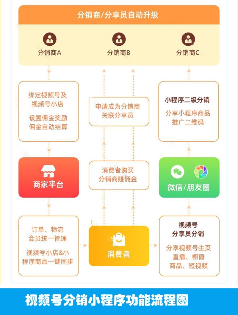 视频号分销小程序是基于微信视频号内容分享的分销与佣金结算解决方案。通过该系统,商家可以实现视频号小店的绑定、分享员的关联管理、佣金结算和订单管理等功能。